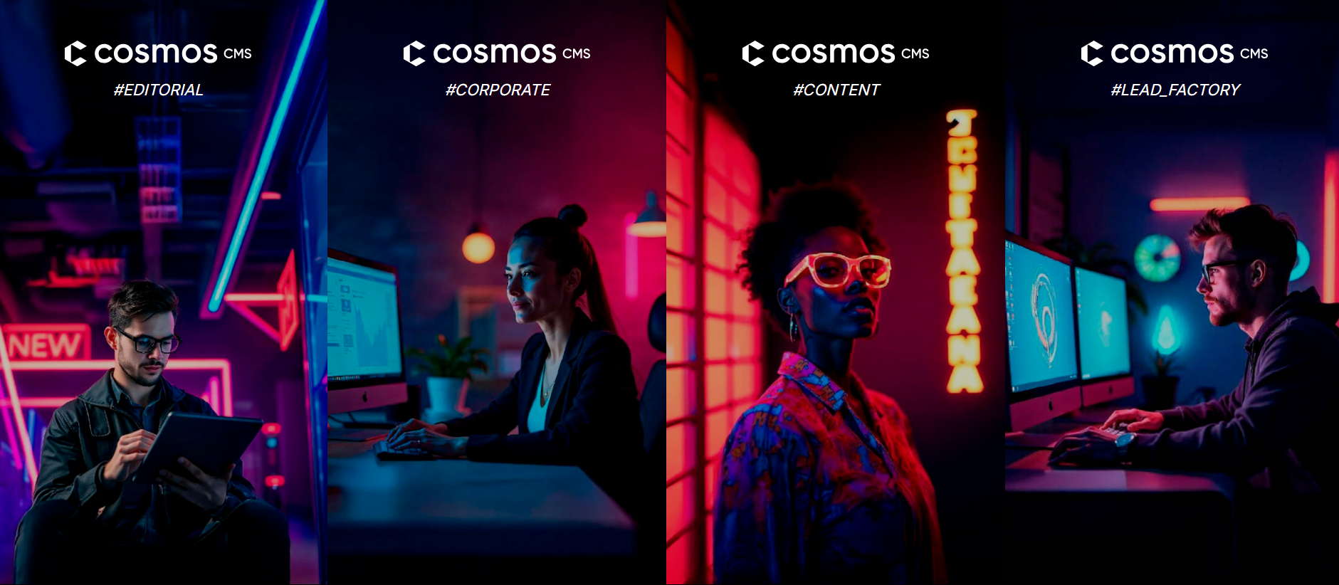 Con sus servicios CosmosCMS Editorial, CosmosCMS Corporate, CosmosCMS Content y CosmosCMS Lead Factory, la plataforma se adapta a distintos tipos de proyectos digitales: