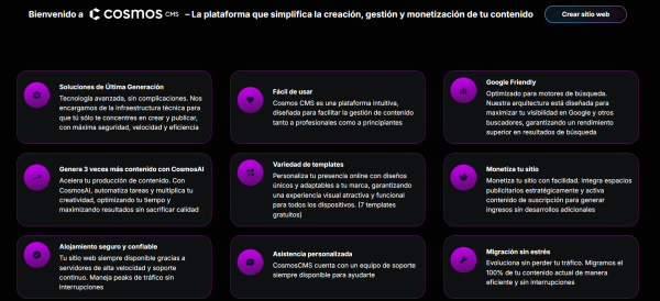 Otro factor atractivo para sus usuarios es el SEO: Cosmos CMS cuenta con optimización técnica avanzada, carga veloz, jerarquía semántica y estructura de metaetiquetado, facilitando el posicionamiento orgánico de los sitios construidos en la plataforma.
